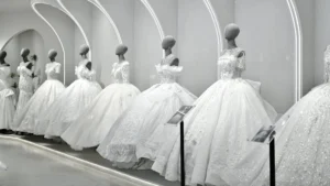 Wedding dresses, lehengas, and gowns are designed with structure, heavy fabric, embroidery, and fitted silhouettes.